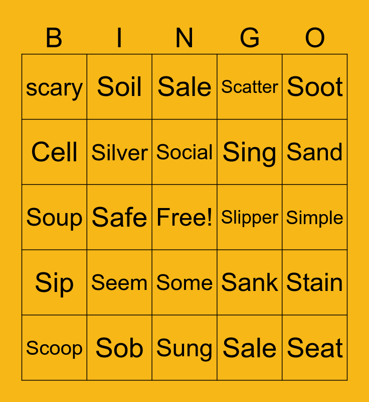 This bingo card has a free space and 24 words: Seem, Sob, Social, Scoop, Soot, scary, Cell, Soil, Slipper, Some, Sing, Soup, Sank, Stain, Silver, Sale, Simple, Sale, Sand, Safe, Seat, Sip, Scatter and Sung.
