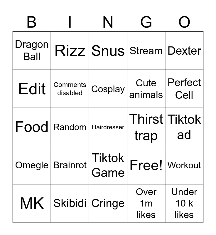 This bingo card has 25 words: Brainrot, Cringe, Cosplay, MK, Dexter, Dragon Ball, Edit, Rizz, Thirst trap, Tiktok Game, Cute animals, Food, Free!, Workout, Comments disabled, Under 10 k likes, Tiktok ad, Snus, Perfect Cell, Random, Hairdresser, Skibidi, Omegle, Stream and Over 1m likes.