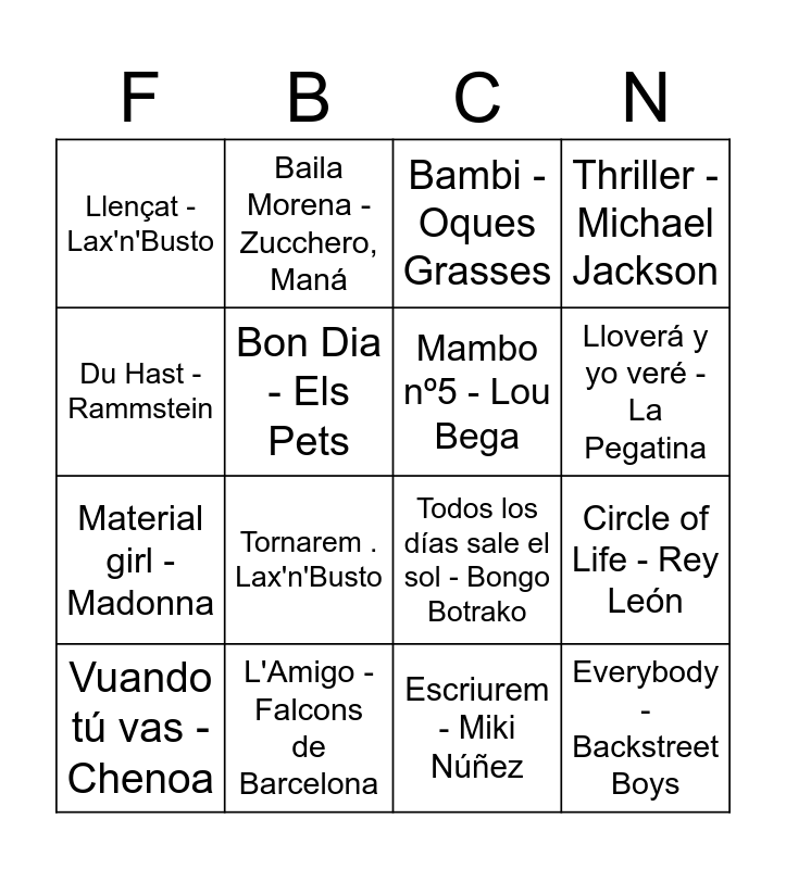 This bingo card has 78 words: Free!, La meva sort - Ginestà, Bambi - Oques Grasses, Vull - Zoo, Que no s'acabi - Figa Flawas, Taboo - Don Omar, Let it go (Frozen) - Idina Menzel, All about that bass - Meghan Trainor, Rueda la corona - La Raíz, Esbarzers - La Gossa Sorda, Bajo el mar (La Sirenita) - Vicente Borland, Coti x Coti - The Tyets, MonDJ, DJCapde, Thriller - Michael Jackson, Llençat - Lax'n'Busto, Jenifer - Els Catarres, Bon Dia - Els Pets, Princesas - Pereza, Corren - Gossos, Física o Química - Despistaos, Escriurem - Miki Núñez, Boig per tu - Sau, Du Hast - Rammstein, Todos los días sale el sol - Bongo Botrako, Lloverá y yo veré - La Pegatina, Mambo nº5 - Lou Bega, It's Not Unusual - Tom Jones, Amigos para siempre - Los Manolos, Livin'la Vida Loca - Ricky Martin, La gent que estimo - Oques Grasses, Rita Payés, Sweet Dreams - Eurythmics, Annie Lennox, Tornarem . Lax'n'Busto, Ghostbusters - Ray Parker Jr, La Muixeranga - La Fúmiga, Pere Joan, La Gossa Sorda, Falcons de Barcelona - Falcons de Barcelona, Tainted Love - Soft Cell, L'Amigo - Falcons de Barcelona, Bailoteo - The Tyets, La Marina sta morena - Figa Flawas, Barcie Girl - Aqua, Vuando tú vas - Chenoa, La bomba - King Africa, Bulería - David Bisbal, Llum, foc, destrucció (Bola de Drac) - SX3, La canción de Bluey - Bluey, Baila el Chiki Chiki - Rodolfo Chikilicuatre, Tata Golosa, Baila Morena - Zucchero, Maná, Mon Amour - Zzoilo, Aitana, Ya no quiero ná - Lola Índigo, Gangnam Style - PSY, Las 12 - Anan Mena, Belinda, Tobogan - Zoo, Circle of Life - Rey León, Doraemon - SX3, Baby one more time - Britney Spears, My heart will go on - Céline Dion, I kissed a girl - Katy Perry, Crazy in love - Beyoncé, Jay-Z, Run the world - Beyoncé, Run Boy Run - Woodkid, Pokémon Theme - Pokémon, Material girl - Madonna, Padam padam - Kylie Minogue, Mi música es tu voz - Academia OT1, Go West - Pet Shop Boys, Vas a volverme loca - Natalia, 20 de enero - La Oreja de Van Gogh, La Playa - La Oreja de Van Gogh, Lady marmalade - Christina Aguilera, Everybody - Backstreet Boys, Limbo - Daddy Yankee, Saturday Night - Whigfield, Mayonesa - Chocolate, Músic de carrer - Txarango, Thunder - Imagine Dragons, Bailando - Nil Moliner, Wakew me up before you go-go - Wham!, Uptown Funk - Mark Ronson, Bruno Mars and Love is in the air - John Paul Young.