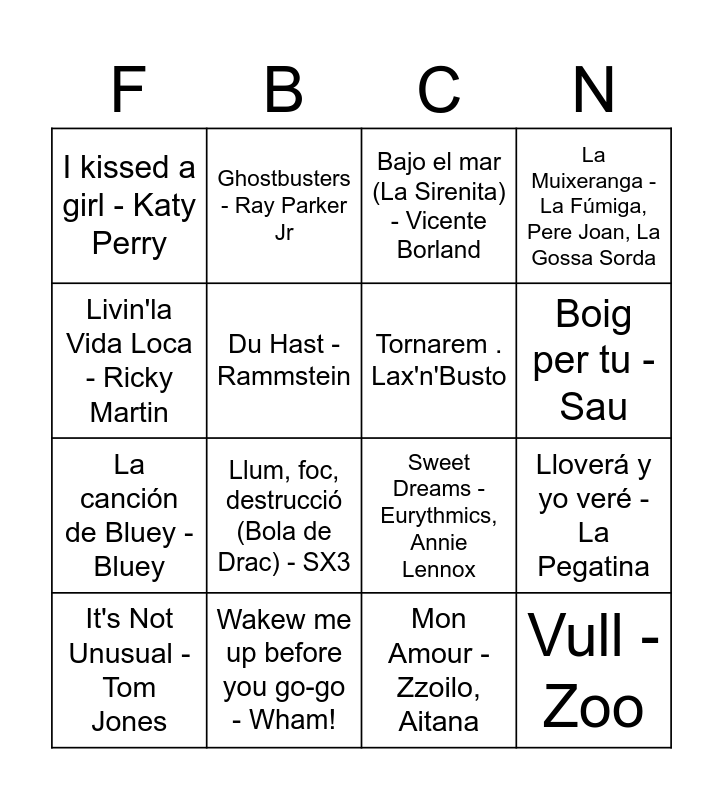 This bingo card has 77 words: Rueda la corona - La Raíz, Esbarzers - La Gossa Sorda, Bajo el mar (La Sirenita) - Vicente Borland, Coti x Coti - The Tyets, MonDJ, DJCapde, Thriller - Michael Jackson, Llençat - Lax'n'Busto, Jenifer - Els Catarres, Bon Dia - Els Pets, Princesas - Pereza, Corren - Gossos, Física o Química - Despistaos, Escriurem - Miki Núñez, Boig per tu - Sau, Du Hast - Rammstein, Todos los días sale el sol - Bongo Botrako, Lloverá y yo veré - La Pegatina, Mambo nº5 - Lou Bega, It's Not Unusual - Tom Jones, Amigos para siempre - Los Manolos, Livin'la Vida Loca - Ricky Martin, La gent que estimo - Oques Grasses, Rita Payés, Sweet Dreams - Eurythmics, Annie Lennox, Tornarem . Lax'n'Busto, Ghostbusters - Ray Parker Jr, La Muixeranga - La Fúmiga, Pere Joan, La Gossa Sorda, Falcons de Barcelona - Falcons de Barcelona, Tainted Love - Soft Cell, L'Amigo - Falcons de Barcelona, Bailoteo - The Tyets, La Marina sta morena - Figa Flawas, Barcie Girl - Aqua, Vuando tú vas - Chenoa, La bomba - King Africa, Bulería - David Bisbal, Llum, foc, destrucció (Bola de Drac) - SX3, La canción de Bluey - Bluey, Baila el Chiki Chiki - Rodolfo Chikilicuatre, Tata Golosa, Baila Morena - Zucchero, Maná, Mon Amour - Zzoilo, Aitana, Ya no quiero ná - Lola Índigo, Gangnam Style - PSY, Las 12 - Anan Mena, Belinda, Tobogan - Zoo, Circle of Life - Rey León, Doraemon - SX3, Baby one more time - Britney Spears, My heart will go on - Céline Dion, I kissed a girl - Katy Perry, Crazy in love - Beyoncé, Jay-Z, Run the world - Beyoncé, Run Boy Run - Woodkid, Pokémon Theme - Pokémon, Material girl - Madonna, Padam padam - Kylie Minogue, Mi música es tu voz - Academia OT1, Go West - Pet Shop Boys, Vas a volverme loca - Natalia, 20 de enero - La Oreja de Van Gogh, La Playa - La Oreja de Van Gogh, Lady marmalade - Christina Aguilera, Everybody - Backstreet Boys, Limbo - Daddy Yankee, Saturday Night - Whigfield, Mayonesa - Chocolate, Músic de carrer - Txarango, Thunder - Imagine Dragons, Bailando - Nil Moliner, Wakew me up before you go-go - Wham!, Uptown Funk - Mark Ronson, Bruno Mars, Love is in the air - John Paul Young, La meva sort - Ginestà, Bambi - Oques Grasses, Vull - Zoo, Que no s'acabi - Figa Flawas, Taboo - Don Omar, Let it go (Frozen) - Idina Menzel and All about that bass - Meghan Trainor.