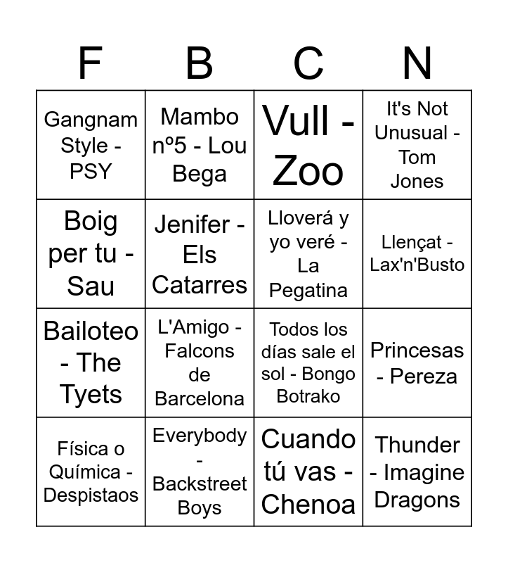 This bingo card has 77 words: La meva sort - Ginestà, Bambi - Oques Grasses, Vull - Zoo, Que no s'acabi - Figa Flawas, Taboo - Don Omar, Let it go (Frozen) - Idina Menzel, All about that bass - Meghan Trainor, Rueda la corona - La Raíz, Esbarzers - La Gossa Sorda, Bajo el mar (La Sirenita) - Vicente Borland, Coti x Coti - The Tyets, MonDJ, DJCapde, Thriller - Michael Jackson, Llençat - Lax'n'Busto, Jenifer - Els Catarres, Bon Dia - Els Pets, Princesas - Pereza, Corren - Gossos, Física o Química - Despistaos, Escriurem - Miki Núñez, Boig per tu - Sau, Du Hast - Rammstein, Todos los días sale el sol - Bongo Botrako, Lloverá y yo veré - La Pegatina, Mambo nº5 - Lou Bega, It's Not Unusual - Tom Jones, Amigos para siempre - Los Manolos, Livin'la Vida Loca - Ricky Martin, La gent que estimo - Oques Grasses, Rita Payés, Sweet Dreams - Eurythmics, Annie Lennox, Tornarem . Lax'n'Busto, Ghostbusters - Ray Parker Jr, La Muixeranga - La Fúmiga, Pere Joan, La Gossa Sorda, Falcons de Barcelona - Falcons de Barcelona, Tainted Love - Soft Cell, L'Amigo - Falcons de Barcelona, Bailoteo - The Tyets, La Marina sta morena - Figa Flawas, Barcie Girl - Aqua, Cuando tú vas - Chenoa, La bomba - King Africa, Bulería - David Bisbal, Llum, foc, destrucció (Bola de Drac) - SX3, La canción de Bluey - Bluey, Baila el Chiki Chiki - Rodolfo Chikilicuatre, Tata Golosa, Baila Morena - Zucchero, Maná, Mon Amour - Zzoilo, Aitana, Ya no quiero ná - Lola Índigo, Gangnam Style - PSY, Las 12 - Anan Mena, Belinda, Tobogan - Zoo, Circle of Life - Rey León, Doraemon - SX3, Baby one more time - Britney Spears, My heart will go on - Céline Dion, I kissed a girl - Katy Perry, Crazy in love - Beyoncé, Jay-Z, Run the world - Beyoncé, Run Boy Run - Woodkid, Pokémon Theme - Pokémon, Material girl - Madonna, Padam padam - Kylie Minogue, Mi música es tu voz - Academia OT1, Go West - Pet Shop Boys, Vas a volverme loca - Natalia, 20 de enero - La Oreja de Van Gogh, La Playa - La Oreja de Van Gogh, Lady marmalade - Christina Aguilera, Everybody - Backstreet Boys, Limbo - Daddy Yankee, Saturday Night - Whigfield, Mayonesa - Chocolate, Músic de carrer - Txarango, Thunder - Imagine Dragons, Bailando - Nil Moliner, Wakew me up before you go-go - Wham!, Uptown Funk - Mark Ronson, Bruno Mars and Love is in the air - John Paul Young.