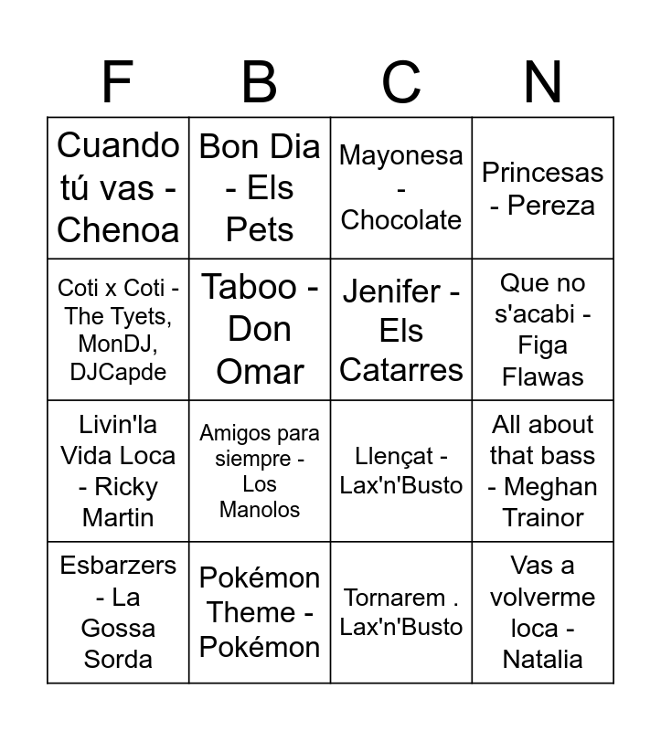This bingo card has 77 words: Limbo - Daddy Yankee, Saturday Night - Whigfield, Mayonesa - Chocolate, Músic de carrer - Txarango, Thunder - Imagine Dragons, Bailando - Nil Moliner, Wakew me up before you go-go - Wham!, Uptown Funk - Mark Ronson, Bruno Mars, Love is in the air - John Paul Young, La meva sort - Ginestà, Bambi - Oques Grasses, Vull - Zoo, Que no s'acabi - Figa Flawas, Taboo - Don Omar, Let it go (Frozen) - Idina Menzel, All about that bass - Meghan Trainor, Rueda la corona - La Raíz, Esbarzers - La Gossa Sorda, Bajo el mar (La Sirenita) - Vicente Borland, Coti x Coti - The Tyets, MonDJ, DJCapde, Thriller - Michael Jackson, Llençat - Lax'n'Busto, Jenifer - Els Catarres, Bon Dia - Els Pets, Princesas - Pereza, Corren - Gossos, Física o Química - Despistaos, Escriurem - Miki Núñez, Boig per tu - Sau, Du Hast - Rammstein, Todos los días sale el sol - Bongo Botrako, Lloverá y yo veré - La Pegatina, Mambo nº5 - Lou Bega, It's Not Unusual - Tom Jones, Amigos para siempre - Los Manolos, Livin'la Vida Loca - Ricky Martin, La gent que estimo - Oques Grasses, Rita Payés, Sweet Dreams - Eurythmics, Annie Lennox, Tornarem . Lax'n'Busto, Ghostbusters - Ray Parker Jr, La Muixeranga - La Fúmiga, Pere Joan, La Gossa Sorda, Falcons de Barcelona - Falcons de Barcelona, Tainted Love - Soft Cell, L'Amigo - Falcons de Barcelona, Bailoteo - The Tyets, La Marina sta morena - Figa Flawas, Barcie Girl - Aqua, Cuando tú vas - Chenoa, La bomba - King Africa, Bulería - David Bisbal, Llum, foc, destrucció (Bola de Drac) - SX3, La canción de Bluey - Bluey, Baila el Chiki Chiki - Rodolfo Chikilicuatre, Tata Golosa, Baila Morena - Zucchero, Maná, Mon Amour - Zzoilo, Aitana, Ya no quiero ná - Lola Índigo, Gangnam Style - PSY, Las 12 - Anan Mena, Belinda, Tobogan - Zoo, Circle of Life - Rey León, Doraemon - SX3, Baby one more time - Britney Spears, My heart will go on - Céline Dion, I kissed a girl - Katy Perry, Crazy in love - Beyoncé, Jay-Z, Run the world - Beyoncé, Run Boy Run - Woodkid, Pokémon Theme - Pokémon, Material girl - Madonna, Padam padam - Kylie Minogue, Mi música es tu voz - Academia OT1, Go West - Pet Shop Boys, Vas a volverme loca - Natalia, 20 de enero - La Oreja de Van Gogh, La Playa - La Oreja de Van Gogh, Lady marmalade - Christina Aguilera and Everybody - Backstreet Boys.