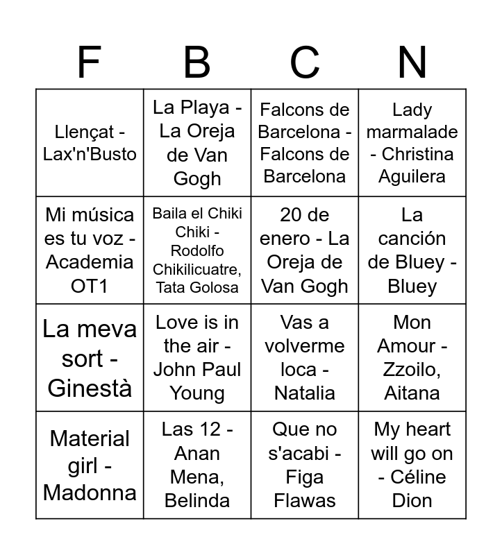 This bingo card has 77 words: Ghostbusters - Ray Parker Jr, La Muixeranga - La Fúmiga, Pere Joan, La Gossa Sorda, Falcons de Barcelona - Falcons de Barcelona, Tainted Love - Soft Cell, L'Amigo - Falcons de Barcelona, Bailoteo - The Tyets, La Marina sta morena - Figa Flawas, Barcie Girl - Aqua, Vuando tú vas - Chenoa, La bomba - King Africa, Bulería - David Bisbal, Llum, foc, destrucció (Bola de Drac) - SX3, La canción de Bluey - Bluey, Baila el Chiki Chiki - Rodolfo Chikilicuatre, Tata Golosa, Baila Morena - Zucchero, Maná, Mon Amour - Zzoilo, Aitana, Pokémon Theme - Pokémon, Material girl - Madonna, Padam padam - Kylie Minogue, Mi música es tu voz - Academia OT1, Go West - Pet Shop Boys, Vas a volverme loca - Natalia, 20 de enero - La Oreja de Van Gogh, La Playa - La Oreja de Van Gogh, Lady marmalade - Christina Aguilera, Everybody - Backstreet Boys, Limbo - Daddy Yankee, Saturday Night - Whigfield, Mayonesa - Chocolate, Músic de carrer - Txarango, Thunder - Imagine Dragons, Bailando - Nil Moliner, Wakew me up before you go-go - Wham!, Uptown Funk - Mark Ronson, Bruno Mars, Love is in the air - John Paul Young, La meva sort - Ginestà, Bambi - Oques Grasses, Vull - Zoo, Que no s'acabi - Figa Flawas, Taboo - Don Omar, Let it go (Frozen) - Idina Menzel, All about that bass - Meghan Trainor, Rueda la corona - La Raíz, Esbarzers - La Gossa Sorda, Bajo el mar (La Sirenita) - Vicente Borland, Coti x Coti - The Tyets, MonDJ, DJCapde, Thriller - Michael Jackson, Llençat - Lax'n'Busto, Jenifer - Els Catarres, Bon Dia - Els Pets, Princesas - Pereza, Corren - Gossos, Física o Química - Despistaos, Escriurem - Miki Núñez, Boig per tu - Sau, Du Hast - Rammstein, Todos los días sale el sol - Bongo Botrako, Lloverá y yo veré - La Pegatina, Mambo nº5 - Lou Bega, It's Not Unusual - Tom Jones, Amigos para siempre - Los Manolos, Livin'la Vida Loca - Ricky Martin, La gent que estimo - Oques Grasses, Rita Payés, Sweet Dreams - Eurythmics, Annie Lennox, Tornarem . Lax'n'Busto, Ya no quiero ná - Lola Índigo, Gangnam Style - PSY, Las 12 - Anan Mena, Belinda, Tobogan - Zoo, Circle of Life - Rey León, Doraemon - SX3, Baby one more time - Britney Spears, My heart will go on - Céline Dion, I kissed a girl - Katy Perry, Crazy in love - Beyoncé, Jay-Z, Run the world - Beyoncé and Run Boy Run - Woodkid.