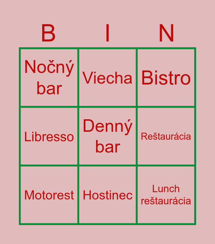This bingo card has 9 words: Motorest, Bistro, Viecha, Libresso, Nočný bar, Reštaurácia, Denný bar, Lunch reštaurácia and Hostinec.