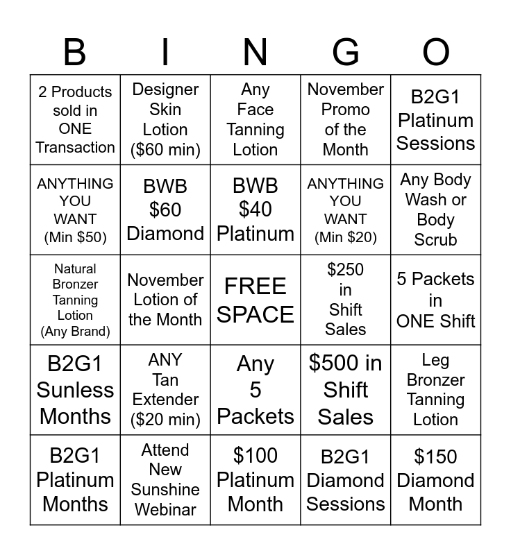 This bingo card has a free space and 34 words: BWB $149 Unlimited, B2G1 Diamond Sessions, B2G1 Diamond Months, B2G1 Sunless Sessions, B2G1 Sunless Months, BWB $60 Diamond, B2G1 Platinum Sessions, B2G1 Platinum Months, Designer Skin Lotion ($60 min), Australian Gold Lotion ($50 min), BWB $40 Platinum, Any Face Tanning Lotion, Intensifier Tanning Lotion (Any Brand), ANY SINGLE Tanning Session, $250 in Shift Sales, Any Body Wash or Body Scrub, Attend New Sunshine Webinar, Natural Bronzer Tanning Lotion (Any Brand), ANY Tan Extender ($20 min), $500 in Shift Sales, Any 5 Packets, JWOWW Hypoallergenic Tanning Lotion (Either Bottle), 2 Products sold in ONE Transaction, 5 Packets in ONE Shift, $100 Platinum Month, $150 Diamond Month, November Promo of the Month, Sell 10 Individual Bed Upgrades, ANYTHING YOU WANT (Min $20), ANYTHING YOU WANT (Min $50), Single Transaction over $150, November Lotion of the Month, Leg Bronzer Tanning Lotion and Any DHA Bronzer Tanning Lotion.