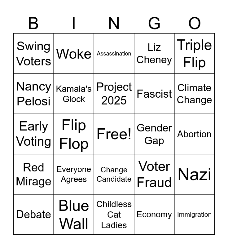 This bingo card has a free space and 30 words: Blue Wall, Eating Pets, Flip Flop, Landslide, Swing Voters, Assassination, Kamala's Glock, Change Candidate, Gender Gap, Childless Cat Ladies, Abortion, Immigration, Economy, Taxes, Climate Change, Polls Were Wrong, Voter Fraud, Red Mirage, Everyone Agrees, Triple Flip, Early Voting, Utah, Woke, Fascist, Nancy Pelosi, Liz Cheney, Nazi, Debate, Project 2025 and COVID.