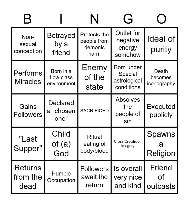 This bingo card has a free space and 24 words: Child of (a) God, Humble Occupation, Enemy of the state, Returns from the dead, Ideal of purity, Non-sexual conception, Performs Miracles, Betrayed by a friend, Absolves the people of sin, Ritual eating of body/blood, Born under Special astrological conditions, Gains Followers, Cross/Crucifixion Imagery, Spawns a Religion, Born in a Low-class environment, Is overall very nice and kind, Executed publicly, Protects the people from demonic harm, Death becomes iconography, Declared a "chosen one", Friend of outcasts, "Last Supper", Outlet for negative energy somehow and Followers await the return.