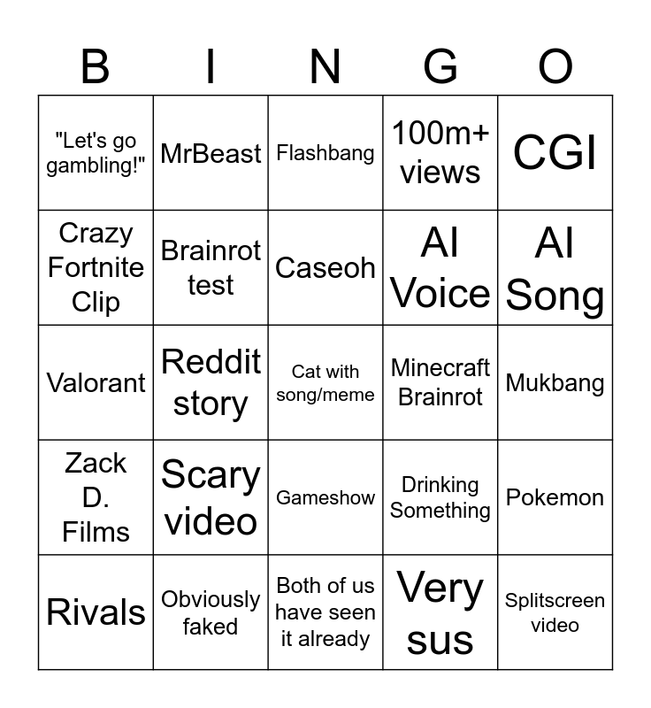 This bingo card has a free space and 24 words: Scary video, Obviously faked, Caseoh, Rivals, CGI, "Let's go gambling!", Crazy Fortnite Clip, MrBeast, Minecraft Brainrot, Gameshow, AI Voice, Valorant, Drinking Something, Pokemon, Brainrot test, Very sus, Mukbang, Flashbang, AI Song, Reddit story, Splitscreen video, Zack D. Films, 100m+ views and Both of us have seen it already.