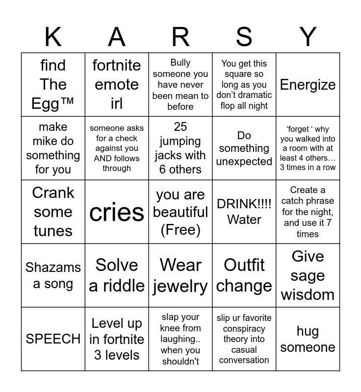 This bingo card has a free space and 24 words: Solve a riddle, Level up in fortnite 3 levels, 25 jumping jacks with 6 others, SPEECH, Energize, find The Egg™, make mike do something for you, fortnite emote irl, DRINK!!!! Water, Wear jewelry, Do something unexpected, Crank some tunes, Outfit change, Give sage wisdom, someone asks for a check against you AND follows through, slip ur favorite conspiracy theory into casual conversation, Create a catch phrase for the night, and use it 7 times, Bully someone you have never been mean to before, ‘forget ‘ why you walked into a room with at least 4 others… 3 times in a row, cries, hug someone, Shazams a song, You get this square so long as you don’t dramatic flop all night and slap your knee from laughing.. when you shouldn't.