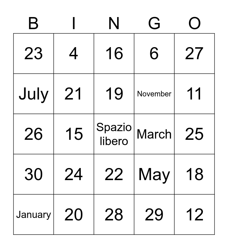 This bingo card has a free space and 29 words: January, 17, 15, June, 23, 16, 21, 24, March, 20, 25, 12, 28, 29, 11, 7, 22, 30, 27, 26, May, 31, November, July, 6, 4, 18, 19 and 10.