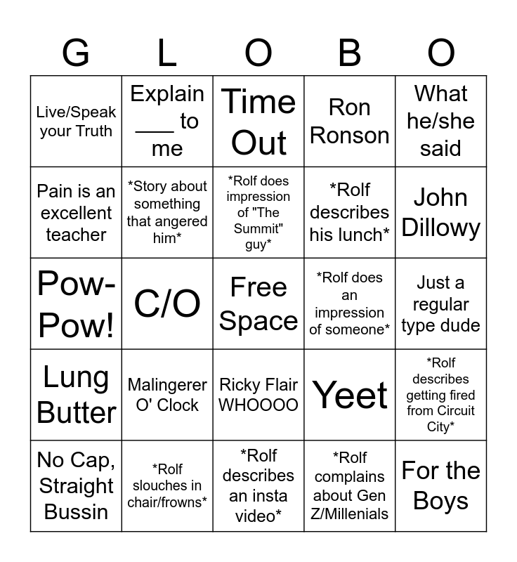 This bingo card has a free space and 29 words: No Cap, Straight Bussin, Aight bois I'm heading south, C/O, We're Better Than You...Globo Gym, Live/Speak your Truth, Time Out, *Story about something that angered him*, Malingerer O' Clock, *Rolf does an impression of someone*, *Rolf slouches in chair/frowns*, Just a regular type dude, For the Boys, *Rolf describes an insta video*, *Rolf complains about Gen Z/Millenials, John Dillowy, "There's Something about Mary" Quote, Ricky Flair WHOOOO, Lung Butter, What he/she said, Pow-Pow!, Yeet, *Rolf complains about us not liking his groupchat post*, *Rolf describes his lunch*, Pain is an excellent teacher, Ron Ronson, Explain ___ to me, *Rolf describes getting fired from Circuit City*, *Rolf does impression of "The Summit" guy* and *Rolf compliments the Marine Corps/disses another service*.