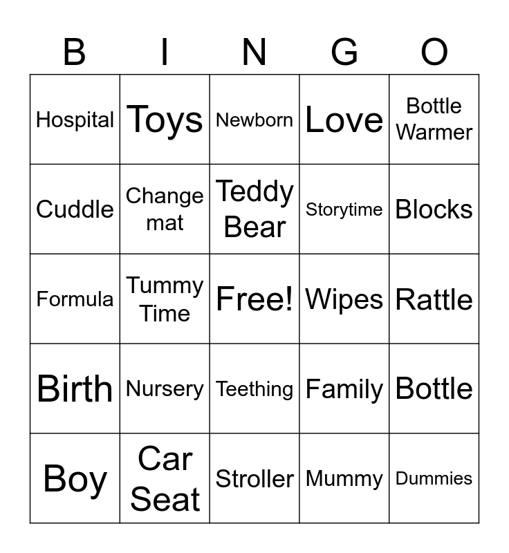 This bingo card has a free space and 44 words: Naps, Dummies, Swaddle, Boy, Girl, Mummy, Newborn, Joy, Bottle Warmer, Car Seat, Love, Wipes, Teething, Nursery, Blankets, Stroller, Milk, Formula, Cloth Nappies, Blocks, Toys, Lullaby, Baby Powder, Hospital, Nappy Rash, Rattle, Mobile, Daddy, Family, Birth, Rocking Chair, Bottle, Monitor, Onesie, Tummy Time, Bouncer, Pregnancy, Crying, Teddy Bear, Cuddle, Storytime, Highchair, Change mat and Booties.
