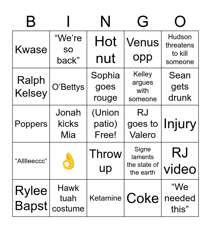 This bingo card has a free space and 24 words: Rylee Bapst, 👌, Sophia goes rouge, Coke, Hudson threatens to kill someone, Kwase, “We’re so back”, Hot nut, RJ goes to Valero, Injury, Poppers, O’Bettys, Signe laments the state of the earth, RJ video, Ralph Kelsey, Hawk tuah costume, Ketamine, Venus opp, Sean gets drunk, “Alllleeccc”, Jonah kicks Mia, Throw up, Kelley argues with someone and “We needed this”.