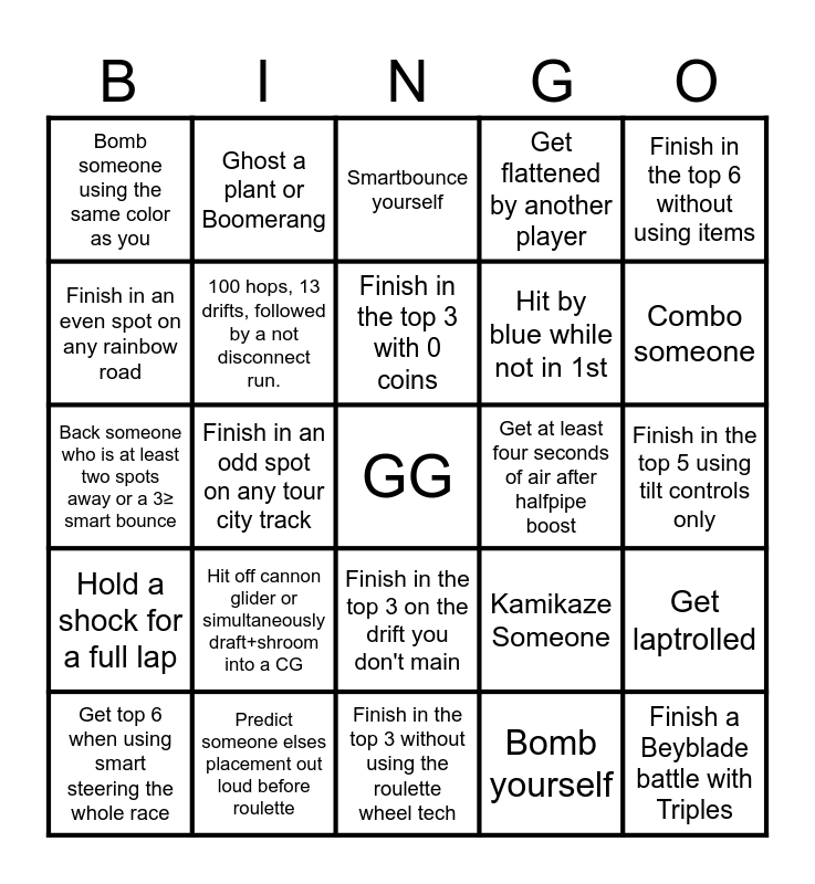 This bingo card has a free space and 67 words: Dodge a blue, Dodge a shock, Laptroll someone, Get laptrolled, Get shocked while holding a shock, Track repick, Ghost a plant or Boomerang, Bullet bill yourself off the track, Finish in the top 3 with 0 coins, Finish in the top 3 while reversing across the finish line, Finish in the top 3 on the drift you don't main, Finish in the top 4 on dEA, Finish in the top 5 using tilt controls only, Finish in the top 6 without using items, Finish in the top 9 without a MT, Finish in an even spot on any rainbow road, Finish in an odd spot on any tour city track, Bomb someone using the same color as you, Fire yourself twice with the same fire flower item, Hit by blue while not in 1st, Hit off cannon glider or simultaneously draft+shroom into a CG, Hold a shock for a full lap, Get flattened by another player, Bomb yourself, Get redded in a bottom 5 spot, Bomb someone with a floor bounce or wall bounce, Pull a blooper, Wall Dodge, Combo someone, Pull shock in a spot other than last, Finish a Beyblade battle with Triples, Hit the same exact track hazard twice in one lap, Get 1st, and get last, Rocket shell after glider or nana snipe, Guess who gets the map pick before the roulette starts, Get top 6 when using smart steering the whole race, Pull off a shroomless offroad cut all three laps, Kamikaze Someone, Back someone who is at least two spots away or a 3≥ smart bounce, Complete over 97 percent of one lap while holding backcam, Holding 20 coins!, 100 hops, 13 drifts, followed by a not disconnect run., Get at least four seconds of air after halfpipe boost, Take no offroad shortcuts or gap jumps all race, Give someone your crazy eight star, Dont fall off with bowser slick tires and motion on, Get the same placement two races in a row, Predict someone elses placement out loud before roulette, Steal someones item who crossed the line already, Pull off an automatic drift MT from wii, Smartbounce yourself, Disconnect lap 3 beginning and have your bot not finish last, Finish in the top 6 only using blue mts, Get 5 kills in one race, Finish in the top 7 while instantly spamming every item you get, Finish in the top 3 without using the roulette wheel tech, Finish top 5 using handheld mode (Except bow), Pacifist: Get in the top 5 without killing a single person, Surprise kill someone by hiding your weapon in second slot, Grab the same box three times without triggering bagging nerfs, Switch your name to match someone,and finish 1-3 spots above them, Finish with ten coins, but don't touch the finish line last lap, Pull a raw luck defense in 1 , and finish within top 3 that race., Announce every item you get w your placement and get top 5, Hold two new items that were added after MK64 at once, Runner a bagger get within the top 6 and Turn around in first and kill someone at finish line.