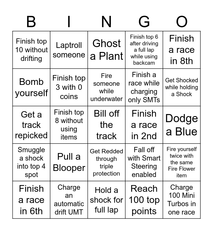 This bingo card has 25 words: Pull a Blooper, Hold a shock for full lap, Fire someone while underwater, Finish a race in 6th, Finish a race in 8th, Finish top 10 without drifting, Bomb yourself, Laptroll someone, Finish a race in 2nd, Get Redded through triple protection, Finish a race while charging only SMTs, Get a track repicked, Fall off with Smart Steering enabled, Fire yourself twice with the same Fire Flower item, Finish top 3 with 0 coins, Charge 100 Mini Turbos in one race, Dodge a Blue, Ghost a Plant, Get Shocked while holding a Shock, Finish top 8 without using items, Bill off the track, Charge an automatic drift UMT, Smuggle a shock into top 4 spot, Finish top 6 after driving a full lap while using backcam and Reach 100 top points.