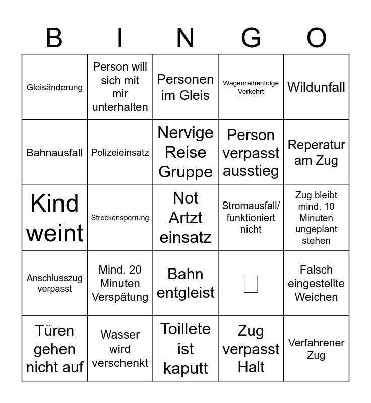 This bingo card has 25 words: Mind. 20 Minuten Verspätung, Toillete ist kaputt, Nervige Reise Gruppe, Türen gehen nicht auf, Wildunfall, Gleisänderung, Bahnausfall, Person will sich mit mir unterhalten, Stromausfall/ funktioniert nicht, Bahn entgleist, Person verpasst ausstieg, Kind weint, 𓆏, Falsch eingestellte Weichen, Polizeieinsatz, Verfahrener Zug, Zug bleibt mind. 10 Minuten ungeplant stehen, Personen im Gleis, Reperatur am Zug, Streckensperrung, Not Artzt einsatz, Wasser wird verschenkt, Anschlusszug verpasst, Wagenreihenfolge Verkehrt and Zug verpasst Halt.