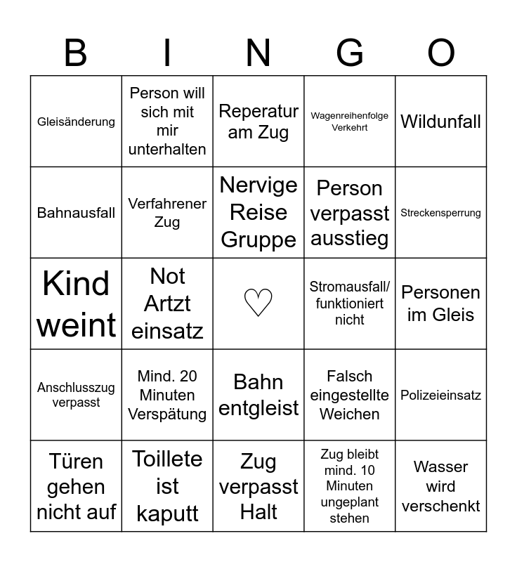 This bingo card has a free space and 24 words: Mind. 20 Minuten Verspätung, Toillete ist kaputt, Nervige Reise Gruppe, Türen gehen nicht auf, Wildunfall, Gleisänderung, Bahnausfall, Person will sich mit mir unterhalten, Stromausfall/ funktioniert nicht, Bahn entgleist, Person verpasst ausstieg, Kind weint, Falsch eingestellte Weichen, Polizeieinsatz, Verfahrener Zug, Zug bleibt mind. 10 Minuten ungeplant stehen, Personen im Gleis, Reperatur am Zug, Streckensperrung, Not Artzt einsatz, Wasser wird verschenkt, Anschlusszug verpasst, Wagenreihenfolge Verkehrt and Zug verpasst Halt.