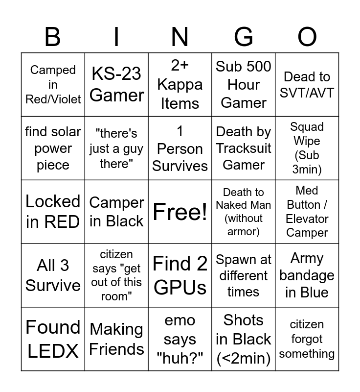 This bingo card has a free space and 46 words: Death by man in the most random room, citizen forgot something, aj says "what?", emo says "huh?", citizen says "get out of this room", lvl 65+ gamer, KS-23 Gamer, Sub 100k Color KeyCard Room, find solar power piece, find intel 3 piece, "there's just a guy there", Sub 500 Hour Gamer, Army bandage in Blue, Spawn at different times, Late Spawn, 2 People Survive, 1 Person Survives, Death to Naked Man (without armor), Impact Naded, Dead to SVT/AVT, Camper in Black, Shots in Black (<2min), Camped in Red/Violet, Death by Tracksuit Gamer, Death by Cheater, Squad Wipe (Sub 3min), Found LEDX, Found Color Keycard, Find 2 GPUs, All 3 Survive, One Shot by Raider, Death to Sitter (<15min remaining in raid), Death by Planter, Looted All Color Keycard Rooms, Raider Squad Wipe, Making Friends, Med Button / Elevator Camper, Knife Fight, Bitbot Death, TK, Lag DC, 2+ Kappa Items, Locked in RED, LEDx in Black, No Backpack Exfil and Raider God Nade.