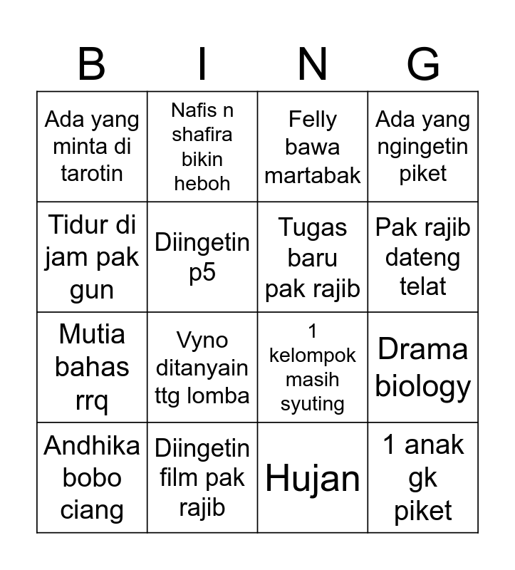 This bingo card has 16 words: Diingetin film pak rajib, Drama biology, Felly bawa martabak, Ada yang minta di tarotin, Mutia bahas rrq, Nafis n shafira bikin heboh, 1 kelompok masih syuting, Hujan, Tidur di jam pak gun, Diingetin p5, Andhika bobo ciang, Ada yang ngingetin piket, Vyno ditanyain ttg lomba, Pak rajib dateng telat, Tugas baru pak rajib and 1 anak gk piket.