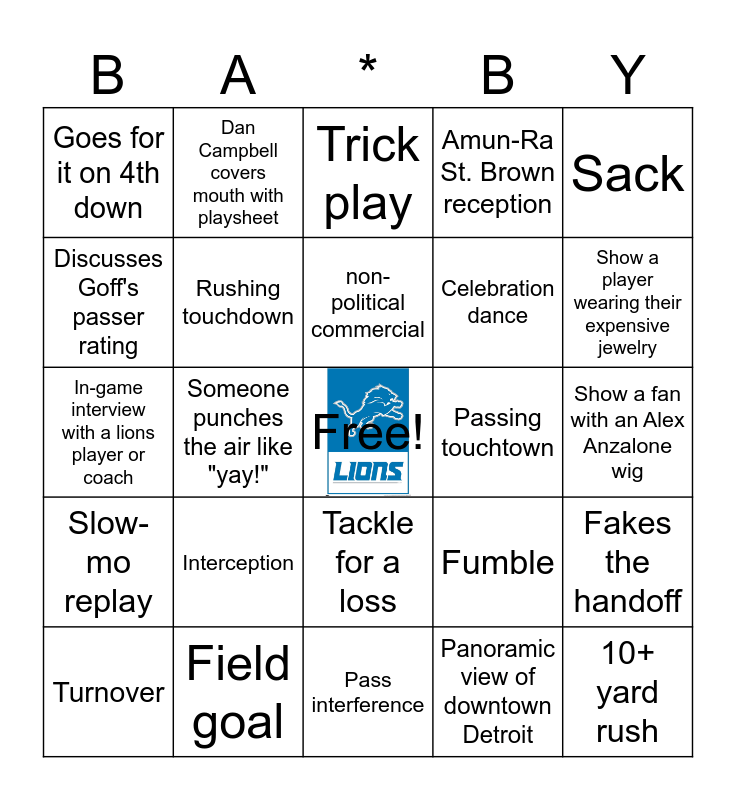 This bingo card has a free space and 24 words: Interception, Field goal, non-political commercial, Turnover, Sack, Goes for it on 4th down, Discusses Goff's passer rating, Dan Campbell covers mouth with playsheet, Passing touchtown, Tackle for a loss, Celebration dance, In-game interview with a lions player or coach, Fumble, Fakes the handoff, Rushing touchdown, Panoramic view of downtown Detroit, Show a fan with an Alex Anzalone wig, Trick play, Show a player wearing their expensive jewelry, Someone punches the air like "yay!", 10+ yard rush, Slow-mo replay, Amun-Ra St. Brown reception and Pass interference.