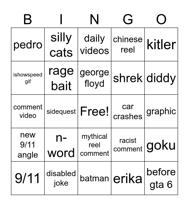 This bingo card has a free space and 24 words: 9/11, n-word, george floyd, erika, kitler, pedro, silly cats, daily videos, car crashes, graphic, comment video, rage bait, racist comment, goku, ishowspeed gif, disabled joke, batman, chinese reel, diddy, new 9/11 angle, sidequest, mythical reel comment, shrek and before gta 6.
