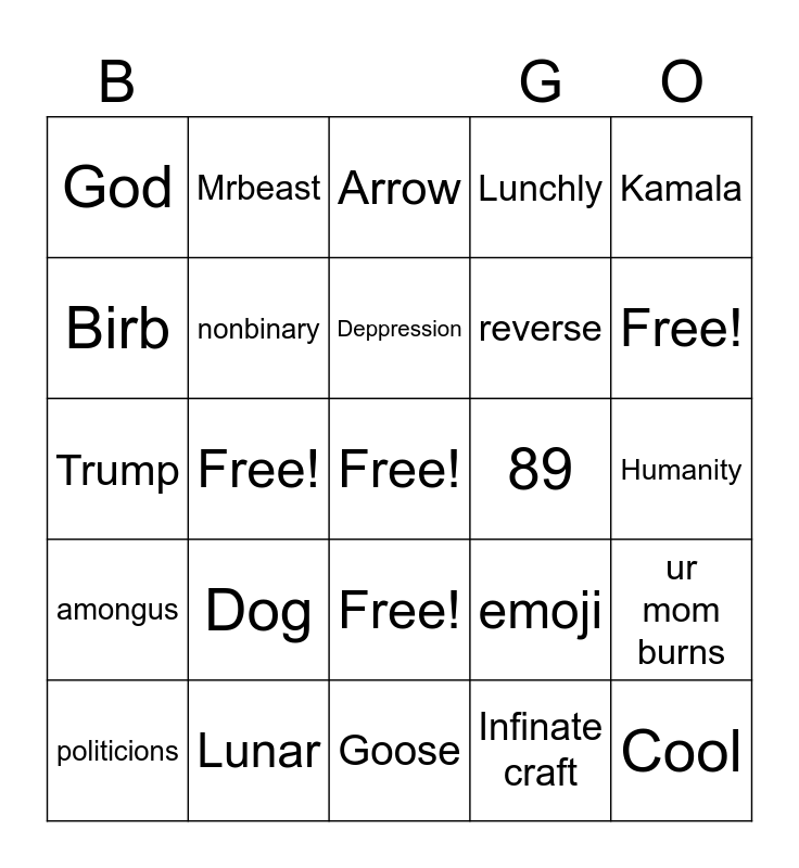 This bingo card has a free space and 24 words: Dog, Lunar, Deppression, politicions, Kamala, God, Birb, Mrbeast, 89, Free!, reverse, Trump, emoji, ur mom burns, nonbinary, Infinate craft, Humanity, Arrow, Free!, Free!, Cool, amongus, Lunchly and Goose.