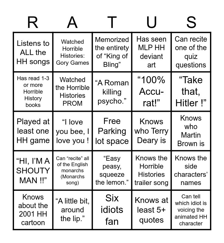 This bingo card has a free space and 24 words: Can “recite” all of the English monarchs (Monarchs song), “A little bit, around the lip.”, “A Roman killing psycho.”, Knows about the 2001 HH cartoon, Can recite one of the quiz questions, Listens to ALL the HH songs, Has read 1-3 or more Horrible History books, Watched Horrible Histories: Gory Games, Knows who Terry Deary is, “Easy peasy, squeeze the lemon.”, “100% Accu-rat!”, Played at least one HH game, Knows the Horrible Histories trailer song, Knows the side characters’ names, Watched the Horrible Histories PROM, Knows at least 5+ quotes, Knows who Martin Brown is, Memorized the entirety of “King of Bling”, “Take that, Hitler !”, “I love you bee, I love you !, Can tell which idiot is voicing the animated HH character, “HI, I’M A SHOUTY MAN !!”, Has seen MLP HH deviant art and Six idiots fan.