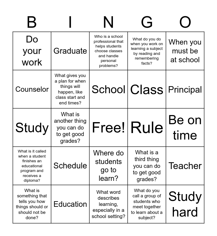 This bingo card has a free space and 28 words: Teacher, Which worker helps a class learn a subject?, Class, What do you call a group of students who meet together to learn about a subject?, Counselor, Who is a school professional that helps students choose classes and handle personal problems?, Graduate, What is it called when a student finishes an educational program and receives a diploma?, Rule, What is something that tells you how things should or should not be done?, Study, What do you do when you work on learning a subject by reading and remembering facts?, Education, What word describes learning, especially in a school setting?, Principal, Who is the person in charge of the school?, Schedule, What gives you a plan for when things will happen, like class start and end times?, School, Where do students go to learn?, Do your work, What is one thing you can do to get good grades?, Study hard, What is another thing you can do to get good grades?, Be on time, What is a third thing you can do to get good grades?, When you must be at school and What information does a school schedule give?.