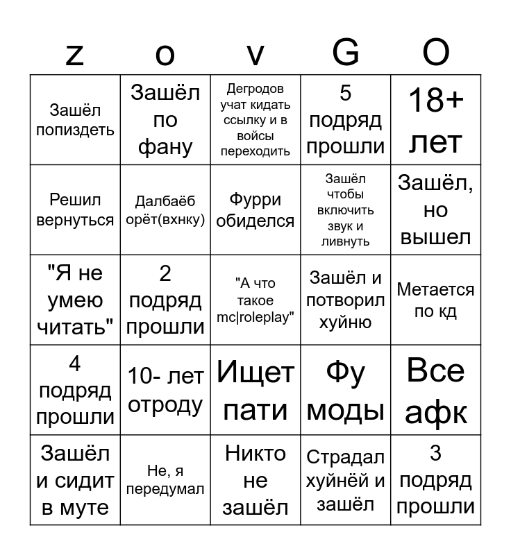 This bingo card has a free space and 24 words: 10- лет отроду, Не, я передумал, Фурри обиделся, Зашёл и сидит в муте, 18+ лет, Зашёл попиздеть, Решил вернуться, Зашёл по фану, Зашёл и потворил хуйню, Ищет пати, Зашёл чтобы включить звук и ливнуть, "Я не умею читать", Фу моды, Все афк, Далбаёб орёт(вхнку), Страдал хуйнёй и зашёл, Метается по кд, Дегродов учат кидать ссылку и в войсы переходить, Зашёл, но вышел, 2 подряд прошли, 3 подряд прошли, 4 подряд прошли, 5 подряд прошли and Никто не зашёл.