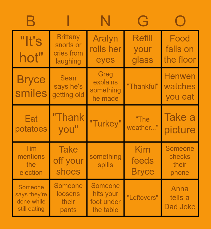 This bingo card has a free space and 36 words: Dean eats while cooking, Someone drops silverware, Merrick needs another napkin, Sean says he's getting old, Kim feeds Bryce, Tim mentions the election, Greg explains something he made, Lars shows his missing teeth, Food falls on the floor, "Pass the butter", "Thank you", Refill your glass, Steel from your neighbor's plate, "The weather...", Henwen watches you eat, "It's hot", "I'm cold", Take off your shoes, Anna tells a Dad Joke, Aralyn rolls her eyes, Take a picture, Someone checks their phone, Someone loosens their pants, Someone says they're done while still eating, Someone hits your foot under the table, Brittany snorts or cries from laughing, Eat potatoes, "Pie", "Thankful", Bryce smiles, Take seconds, "Christmas", "Leftovers", something spills, "football" and "pumpkin".