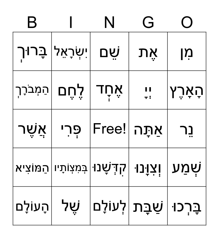 This bingo card has a free space and 32 words: שַׁבָּת, בּוֹרֵא, פְּרִי, הַגָּֽפֶן, הַמּוֹצִיא, לֶחֶם, מִן, שְׁמַע, יִשְׂרָאֵל, אֱלֹהֵינוּ, אֶחָֽד, שֵׁם, כְּבוֹד, מַלְכוּתוֹ, אַתָּה, מֶלֶךְ, הָעוֹלָם, אֲשֶׁר, קִדְּשָׁנוּ, בְּמִצְוֹתָיו, וְצִוָּנוּ, לְהַדְלִיק, נֵר, שֶׁל, בָּרְכוּ, אֶת, יְיָ, הַמְבֹרָךְ, בָּרוּךְ, לְעוֹלָם, וָעֶד and הָאָרֶץ.