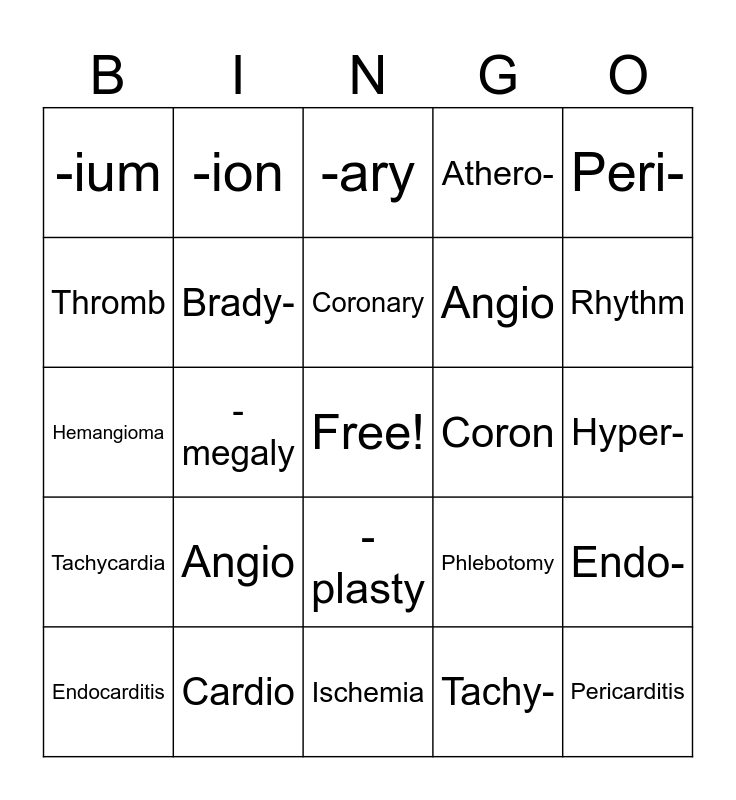 This bingo card has a free space and 58 words: Cardiology, Cardio, -logy, Tachycardia, Tachy-, Bradycardia, Brady-, Angioplasty, Angio, Atherosclerosis, Athero-, Sclero, -sis, Myocardium, Myo, -ium, Pericarditis, Peri-, -itis, Coronary, Coron, -ary, Endocarditis, Endo-, Hypertension, Hyper-, Arrhythmia, A-, Rhythm, -ia, Angina Pectoris, Angina, Pectoris, Hemodynamics, Dynam, -ics, Cardiomegaly, -megaly, Hemangioma, Hem, Angio, -oma, Phlebotomy, Phleb, -tomy, Valvuloplasty, Valvulo, -plasty, Ischemia, Is-, Chemia, Hypotension, Hypo-, Tens, -ion, Thrombosis, Thromb and -osis.