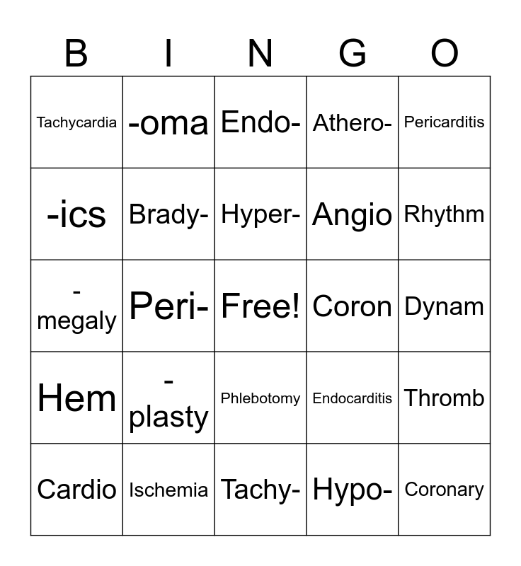 This bingo card has a free space and 57 words: Cardiology, Cardio, -logy, Tachycardia, Tachy-, Bradycardia, Brady-, Angioplasty, Angio, Atherosclerosis, Athero-, Sclero, -sis, Myocardium, Myo, -ium, Pericarditis, Peri-, -itis, Coronary, Coron, -ary, Endocarditis, Endo-, Hypertension, Hyper-, Arrhythmia, A-, Rhythm, -ia, Angina Pectoris, Angina, Pectoris, Hemodynamics, Dynam, -ics, Cardiomegaly, -megaly, Hemangioma, Hem, -oma, Phlebotomy, Phleb, -tomy, Valvuloplasty, Valvulo, -plasty, Ischemia, Is-, Chemia, Hypotension, Hypo-, Tens, -ion, Thrombosis, Thromb and -osis.