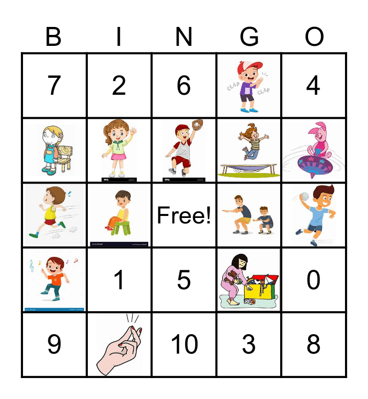 This bingo card has 13 images, a free space and 11 words: 1, 9, 4, 7, 2, 5, 0, 3, 6, 8 and 10.