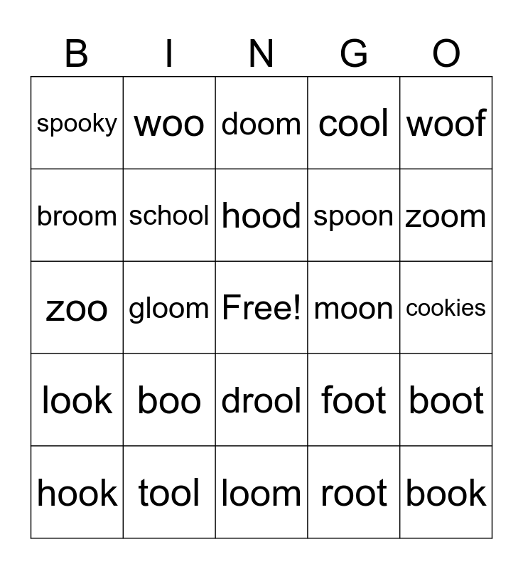 This bingo card has a free space and 24 words: boo, tool, hood, hook, woof, spooky, broom, woo, moon, drool, spoon, zoo, foot, boot, school, root, cookies, doom, zoom, gloom, book, look, cool and loom.