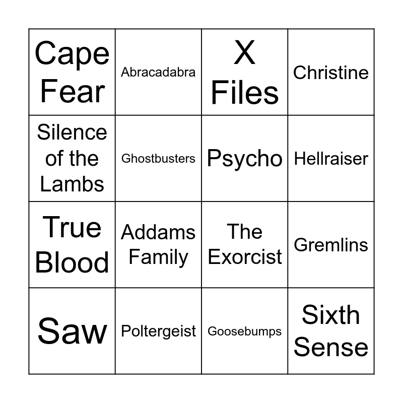 This bingo card has 35 words: The Shining, Nightmare on Elm St, Twilight Zone, Psycho, Halloween, Christine, Ghostbusters, Tales from the Crypt, Hellraiser, The Fog, The Exorcist, Silence of the Lambs, Jaws, Stranger Things, Cape Fear, Poltergeist, The Munsters, Gremlins, Sixth Sense, Saw, IT, Child’s Play, Children of the Corn, Lost Boys, X Files, Addams Family, Phantom of the Opera, Rosemary’s Baby, True Blood, Goosebumps, Thriller, Somebody’s Watching Me, Werewolves in London, Abracadabra and Love Potion No. 9.