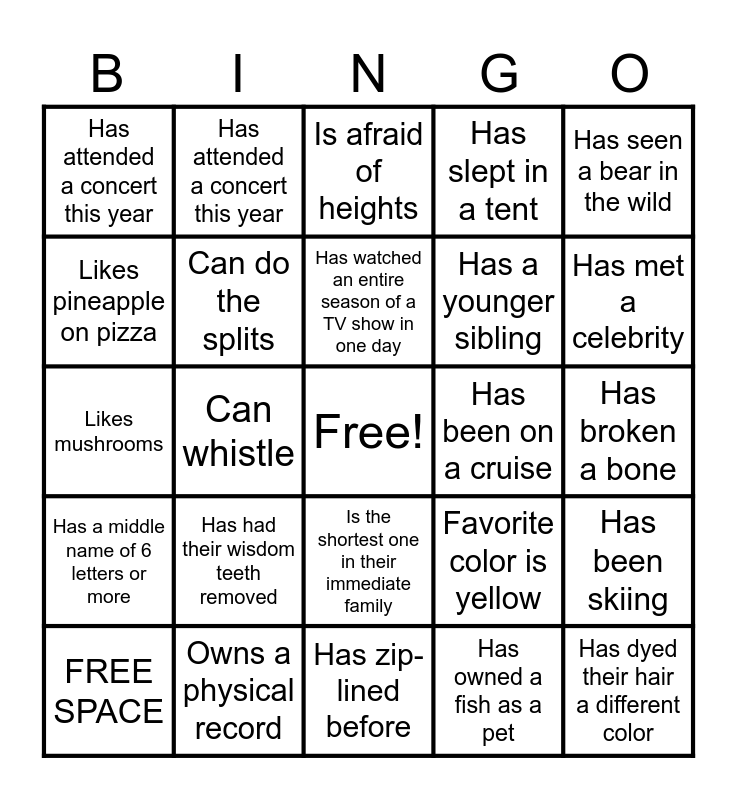 This bingo card has a free space and 27 words: Favorite color is yellow, Has worn braces, Has a younger sibling, Has zip-lined before, Likes pineapple on pizza, Is afraid of heights, Has attended a concert this year, Has a middle name of 6 letters or more, Has been on a cruise, Has been skiing, Likes mushrooms, Has slept in a tent, FREE SPACE, Owns a physical record, Has met a celebrity, Has played a team sport for at least a year, Can do the splits, Has watched an entire season of a TV show in one day, Has had their wisdom teeth removed, Has attended a concert this year, Has broken a bone, Has owned a fish as a pet, Can whistle, Has dyed their hair a different color, Is the shortest one in their immediate family, Has seen a bear in the wild and Has had their wisdom teeth removed.