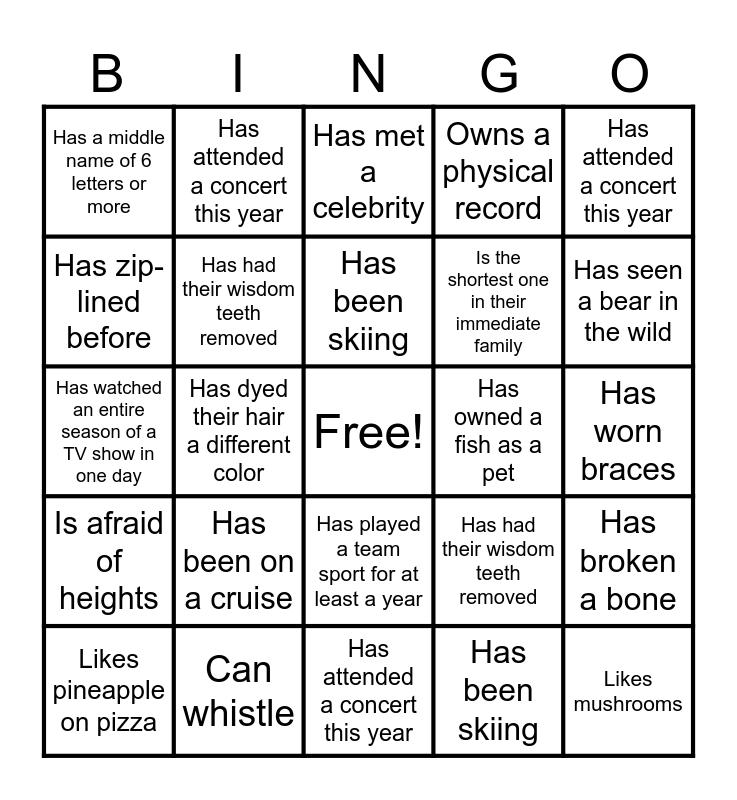 This bingo card has a free space and 28 words: Has broken a bone, Favorite color is yellow, Is the shortest one in their immediate family, Has been skiing, Has zip-lined before, Has met a celebrity, Has attended a concert this year, Is afraid of heights, Has owned a fish as a pet, Likes pineapple on pizza, Has watched an entire season of a TV show in one day, Owns a physical record, Can whistle, Has attended a concert this year, Has seen a bear in the wild, Can do the splits, Has been on a cruise, Has had their wisdom teeth removed, Has been skiing, Has played a team sport for at least a year, Has a middle name of 6 letters or more, Has a younger sibling, Likes mushrooms, Has dyed their hair a different color, Has worn braces, Has had their wisdom teeth removed, Has attended a concert this year and Has slept in a tent.