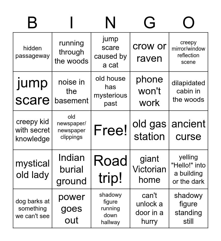 This bingo card has a free space and 34 words: someone runs away while looking back and falls down, can't unlock a door in a hurry, flashlight goes out, people split up for no reason, mystical old lady, noise in the basement, creepy mirror/window reflection scene, dog barks at something we can't see, running through the woods, car won't start, old house has mysterious past, jump scare caused by a cat, character ignores a warning, old man gives a warning, old gas station, dilapidated cabin in the woods, power goes out, creepy kid with secret knowledge, Indian burial ground, giant Victorian home, Road trip!, unusual animal deaths, hidden passageway, ancient curse, shadowy figure running down hallway, shadowy figure standing still, crow or raven, scary stuff in shed/garage, phone won't work, jump scare, a kid's drawing, old newspaper/ newspaper clippings, yelling "Hello!" into a building or the dark and old portraits.