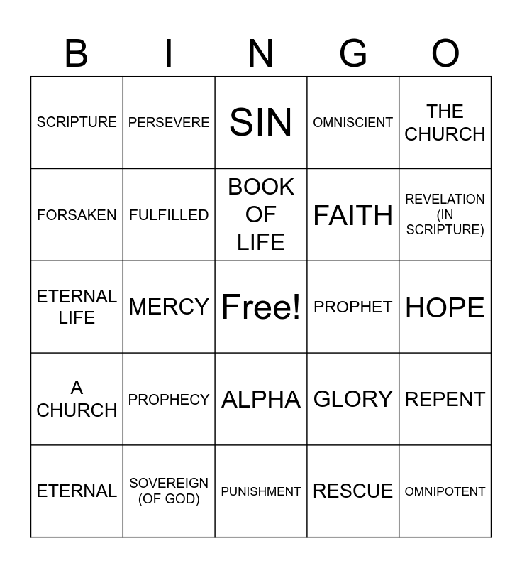 This bingo card has a free space and 29 words: ETERNAL, JUDGE, MERCY, REDEEMER, SCRIPTURE, SIN, FULFILLED, PROPHECY, PROPHET, SOVEREIGN (OF GOD), HOPE, OMNIPOTENT, PUNISHMENT, RESCUE, REVELATION (IN SCRIPTURE), SUFFER, ALPHA, A CHURCH, THE CHURCH, ETERNAL LIFE, GLORY, OMEGA, FAITH, FORSAKEN, OMNISCIENT, PERSEVERE, REPENT, BOOK OF LIFE and GUIDE.