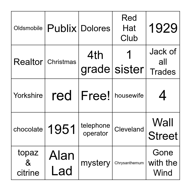 This bingo card has a free space and 33 words: dating years, ice cream, red, Germany, chocolate, Christmas, 1929, topaz & citrine, Publix, scrubbing floors on hands and knees, 4th grade, Dolores, Trojans, Mrs. Gocox doll, housewife, Jack of all Trades, Alan Lad, Yorkshire, 1951, Cleveland, telephone operator, $0.21, Oldsmobile, 4, mystery, Gone with the Wind, Red Hat Club, 1 sister, Realtor, Wall Street, Hoover, Chrysanthemum and Jumping bugs.