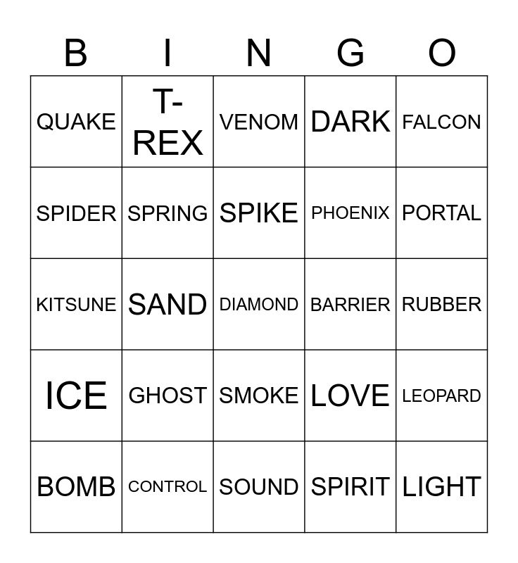 This bingo card has a free space and 39 words: ROCKET, SPIN, CHOP, SPRING, BOMB, SMOKE, SPIKE, FLAME, FALCON, ICE, SAND, DARK, LIGHT, RUBBER, BARRIER, GHOST, MAGMA, QUAKE, BUDDHA, LOVE, SPIDER, SOUND, PHOENIX, PORTAL, RUMBLE, PAIN, BLIZZARD, GRAVITTY, MAMMOTH, T-REX, DOUGH, SHADOW, VENOM, CONTROL, SPIRIT, DRAGON, LEOPARD, KITSUNE and DONE.