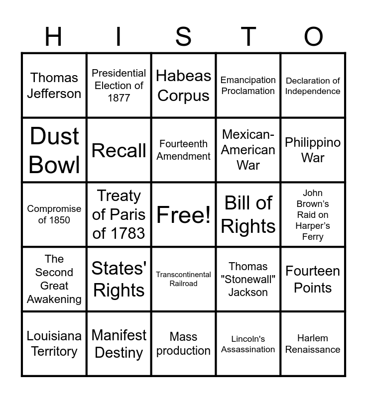 This bingo card has a free space and 157 words: Mercantilism, Transatlantic Trade, Middle Passage, salutary neglect, The Great Awakening, French and Indian War, Treaty of Paris 1763, Proclamation of 1763, Stamp Act, Intolerable Acts, Sons and Daughters of Liberty, Committees of Correspondence, Thomas Paine, Common Sense, Declaration of Independence, Thomas Jefferson, Committee of Five, French Alliance, Benjamin Franklin, George Washington, Baron von Steuben, Marquis de Lafayette, Valley Forge, Battle of Trenton, Battle of Saratoga, Battle of Yorktown, Treaty of Paris of 1783, Articles of Confederation, Land Ordinance of 1785, Northwest Ordinance of 1787, Daniel Shay's Rebellion, The Constitution, Great Compromise, Three-fifths Compromise, limited government, Anti-Federalists, Federalists, The Federalist Papers, Bill of Rights, George Washington's Precedents, Alexander Hamilton and John Adams, John Adams, James Madison, James Monroe, Alien and Sedition Acts, Louisiana Territory, War of 1812, Monroe Doctrine, Jacksonian Democracy, suffrage, Nullification Crisis, States' Rights, Indian Removal Act, Henry Clay, American System, The Second Great Awakening, Temperance, Women's suffrage, Abolitionism, Missouri Compromise 1820, James K. Polk, Manifest Destiny, Texas and Oregon Annexation, Mexican-American War, Sectionalism, Compromise of 1850, Kansas-Nebraska Act, popular sovereignty, Scott v. Sanford, John Brown’s Raid on Harper’s Ferry, The Election of 1860, The Civil War, Habeas Corpus, Emancipation Proclamation, Gettysburg Address, Second Inaugural Address, Ulysses S. Grant, Robert E. Lee, Thomas "Stonewall" Jackson, William T. Sherman, Jefferson Davis, Battle of Fort Sumter, Battle of Antietam, Battle of Gettysburg, Battle of Vicksburg, Battle of Atlanta, Presidential Reconstruction, Congressional Reconstruction, Lincoln's Assassination, Johnson's Impeachment, Freedmen's Bureau, Thirteenth Amendment, Fourteenth Amendment, Fifteenth Amendment, Black Codes, Ku Klux Klan, Presidential Election of 1877, John D. Rockefeller, Andrew Carnegie, Telegraph, Telephone, Electric Light Bulb, Trusts, Monopolies, Ellis Island, Angel Island, American Federation of Labor, Transcontinental Railroad, Plains Indians, Progressive Era, Muckrakers, Upton Sinclair, Jacob Riis, Ida Tarbell, Jane Addams, Plessy v. Ferguson, Jim Crow Laws, NAACP, 17th Amendment, Referendum, Secret ballot, Recall, Conservation Movement, Spanish-American War, Philippino War, Imperialism, Roosevelt Corollary, Panama Canal, neutrality, unrestricted submarine warfare, Zimmerman Telegram, Great Migration, Espionage Act, Eugene Debs, Fourteen Points, League of Nations, Communism, Socialism, Red Scare, National Origins Act, Eighteenth Amendment, Nineteenth Amendment, Mass production, Advertising, Consumerism, Henry Ford, Automobile, Radio and Movies, Jazz, Harlem Renaissance, Overproduction, Under consumption, Stock Market Speculation, Stock Market Crash of 1929, Great Depression, Dust Bowl and Hoovervilles.
