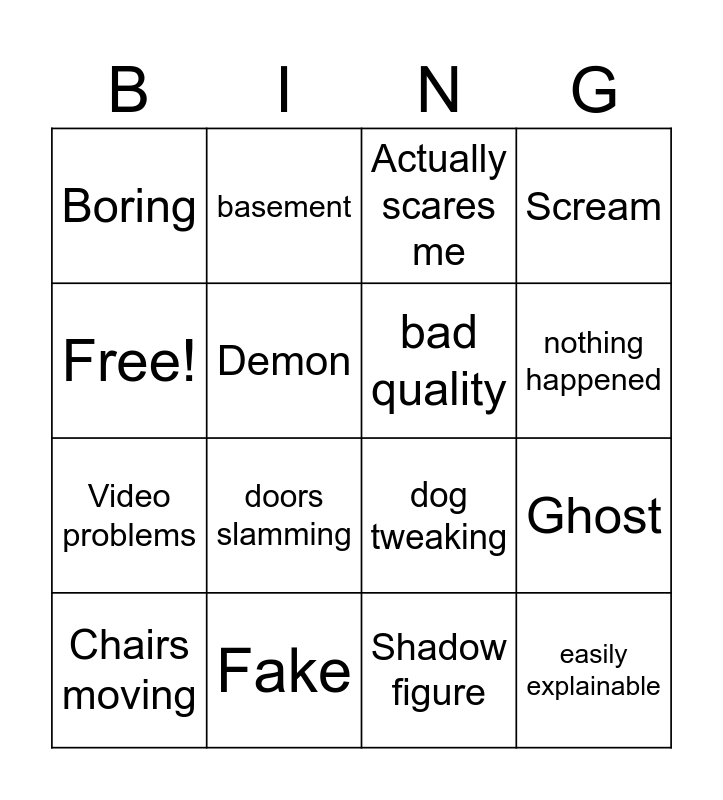 This bingo card has 16 words: Fake, Ghost, Actually scares me, Boring, Video problems, basement, dog tweaking, Shadow figure, Free!, Demon, Chairs moving, Scream, doors slamming, nothing happened, bad quality and easily explainable.