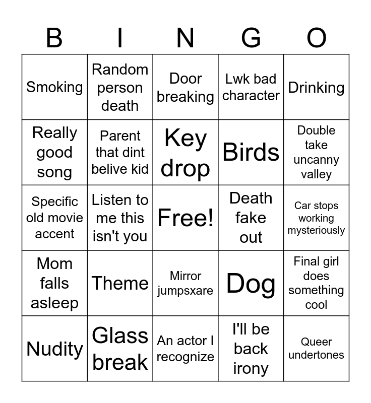 This bingo card has a free space and 24 words: Theme, Glass break, Key drop, Nudity, Drinking, Smoking, Really good song, Random person death, Death fake out, Mirror jumpsxare, Birds, Specific old movie accent, Dog, Final girl does something cool, Parent that dint belive kid, I'll be back irony, Car stops working mysteriously, Door breaking, Double take uncanny valley, Listen to me this isn't you, Queer undertones, Mom falls asleep, Lwk bad character and An actor I recognize.