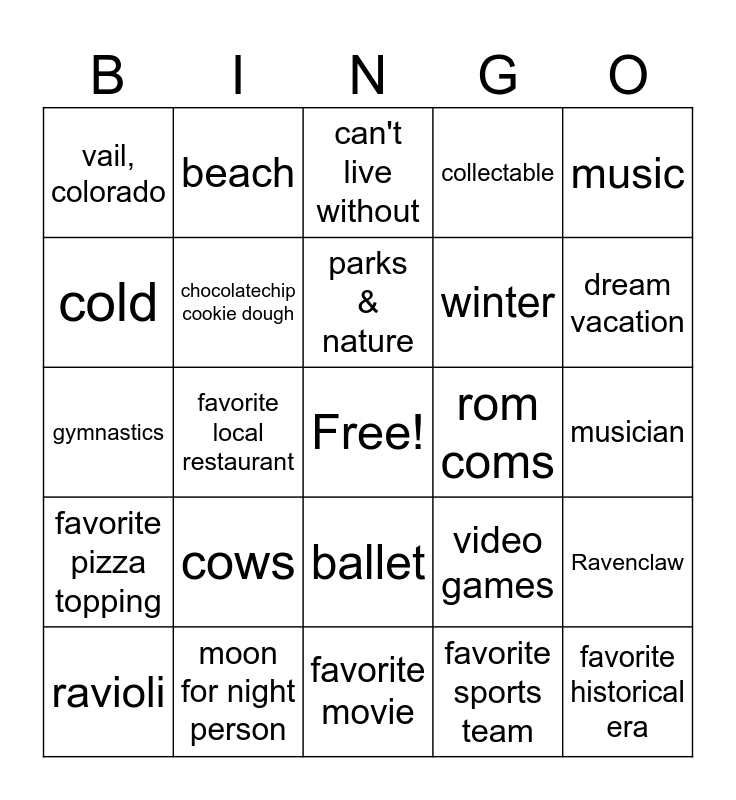 This bingo card has a free space and 24 words: cows, moon for night person, parks & nature, ravioli, music, vail, colorado, cold, beach, rom coms, ballet, winter, gymnastics, video games, Ravenclaw, chocolatechip cookie dough, favorite sports team, musician, can't live without, dream vacation, favorite local restaurant, favorite historical era, favorite pizza topping, collectable and favorite movie.