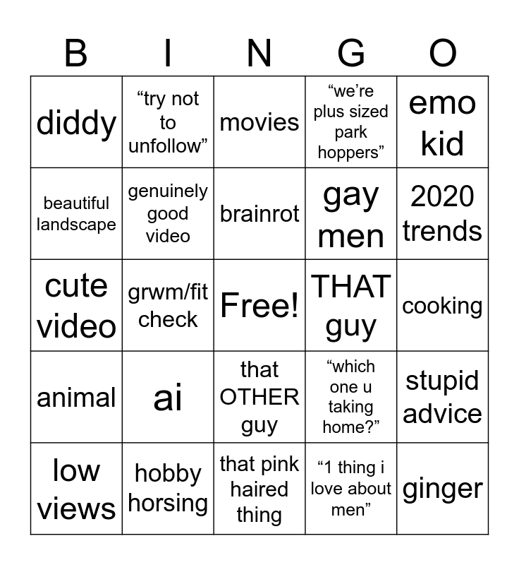 This bingo card has a free space and 24 words: ai, hobby horsing, brainrot, low views, emo kid, diddy, beautiful landscape, “try not to unfollow”, THAT guy, that OTHER guy, gay men, cute video, “which one u taking home?”, stupid advice, genuinely good video, “1 thing i love about men”, cooking, movies, 2020 trends, grwm/fit check, ginger, animal, “we’re plus sized park hoppers” and that pink haired thing.
