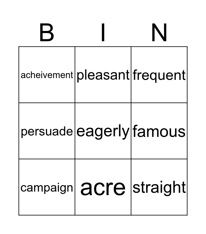 This bingo card has 12 words: tedious, straight, eagerly, famous, pleasant, frequent, acre, anticipate, acheivement, persuade, campaign and freighter.