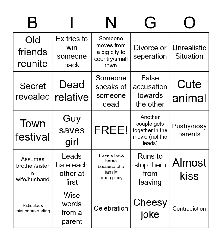 This bingo card has a free space and 24 words: Leads hate each other at first, Wise words from a parent, Someone speaks of someone dead, Ridiculous misunderstanding, Unrealistic Situation, Old friends reunite, Secret revealed, Ex tries to win someone back, Another couple gets together in the movie (not the leads), Travels back home because of a family emergency, False accusation towards the other, Town festival, Runs to stop them from leaving, Almost kiss, Dead relative, Cheesy joke, Pushy/nosy parents, Someone moves from a big city to country/small town, Cute animal, Guy saves girl, Contradiction, Assumes brother/sister is wife/husband, Divorce or seperation and Celebration.