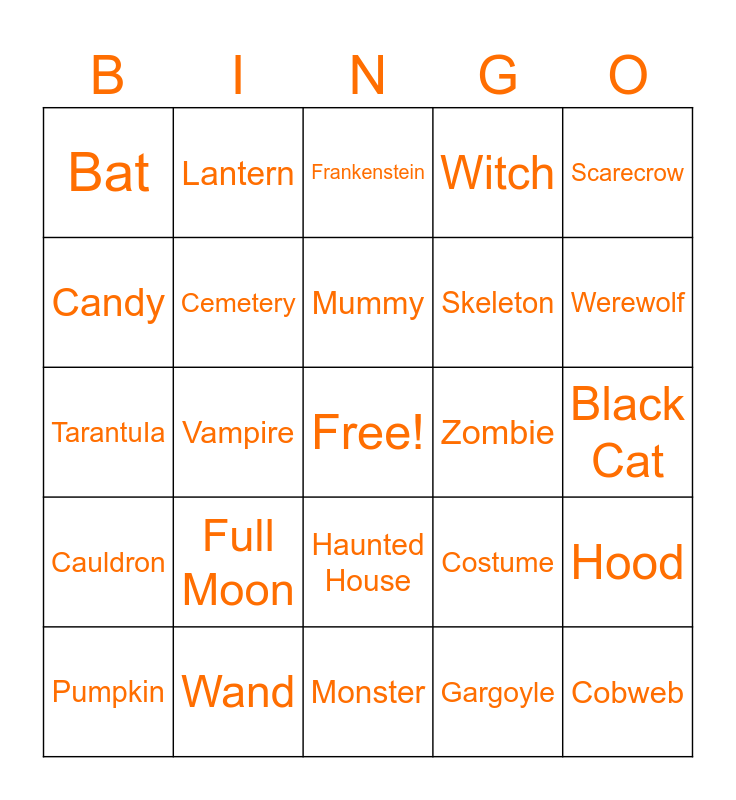 This bingo card has a free space and 39 words: Spider, Broomstick, Magic, Cemetery, Pumpkin, Haunted House, Mummy, Trick-or-Treat, Scarecrow, Cauldron, Vampire, Witch, Cobweb, Black Cat, Zombie, Full Moon, Jack-o'-Lantern, Bat, Ghost, Costume, Candy, Monster, Skeleton, Werewolf, Candle, Potion, Tombstone, Fog, Grave, Lantern, Goblin, Mask, Frankenstein, Wand, Gargoyle, Eyeball, Hood, TarantuIa and Phantom.